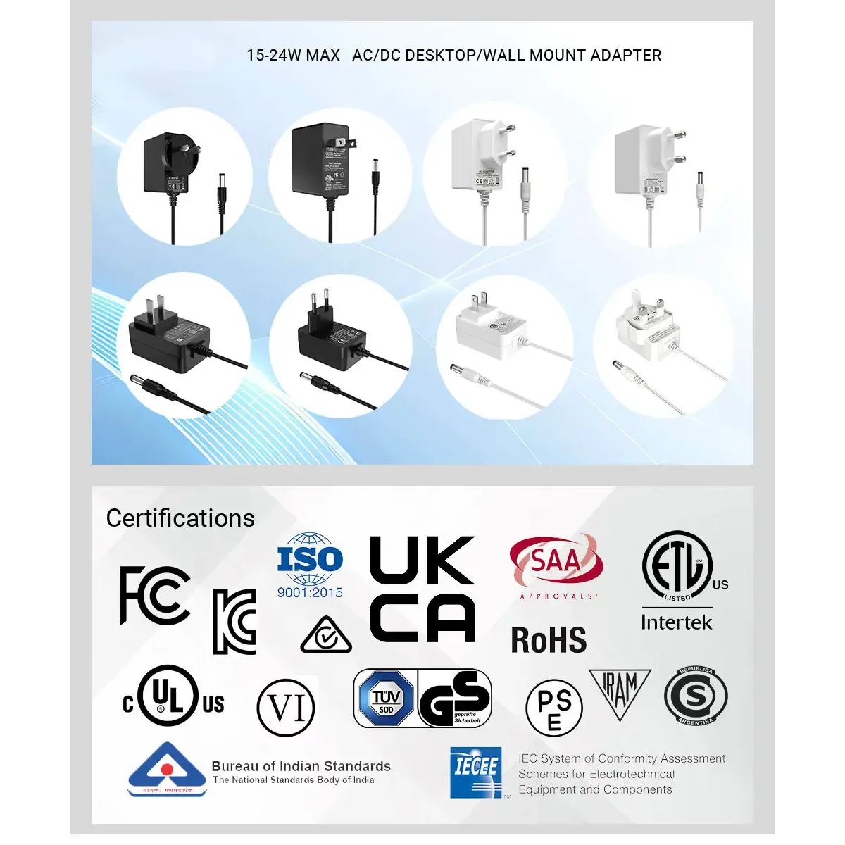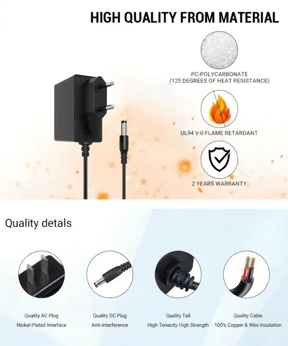سری آداپتورهای برق 24 واتی با استانداردهای سختگیرانه بینالمللی مطابقت دارد و دارای گواهینامههای جهانی، از جمله گواهینامه CE/FCC/UL/RCM/SAA/UKCE/KC/BIS/PSE است که از ایمنی و انطباق با محیطزیست اطمینان میدهد. طراحی فیش اروپایی آن امکان اتصالات امن را فراهم می کند و استفاده از آن را در تنظیمات مختلف آسان می کند.