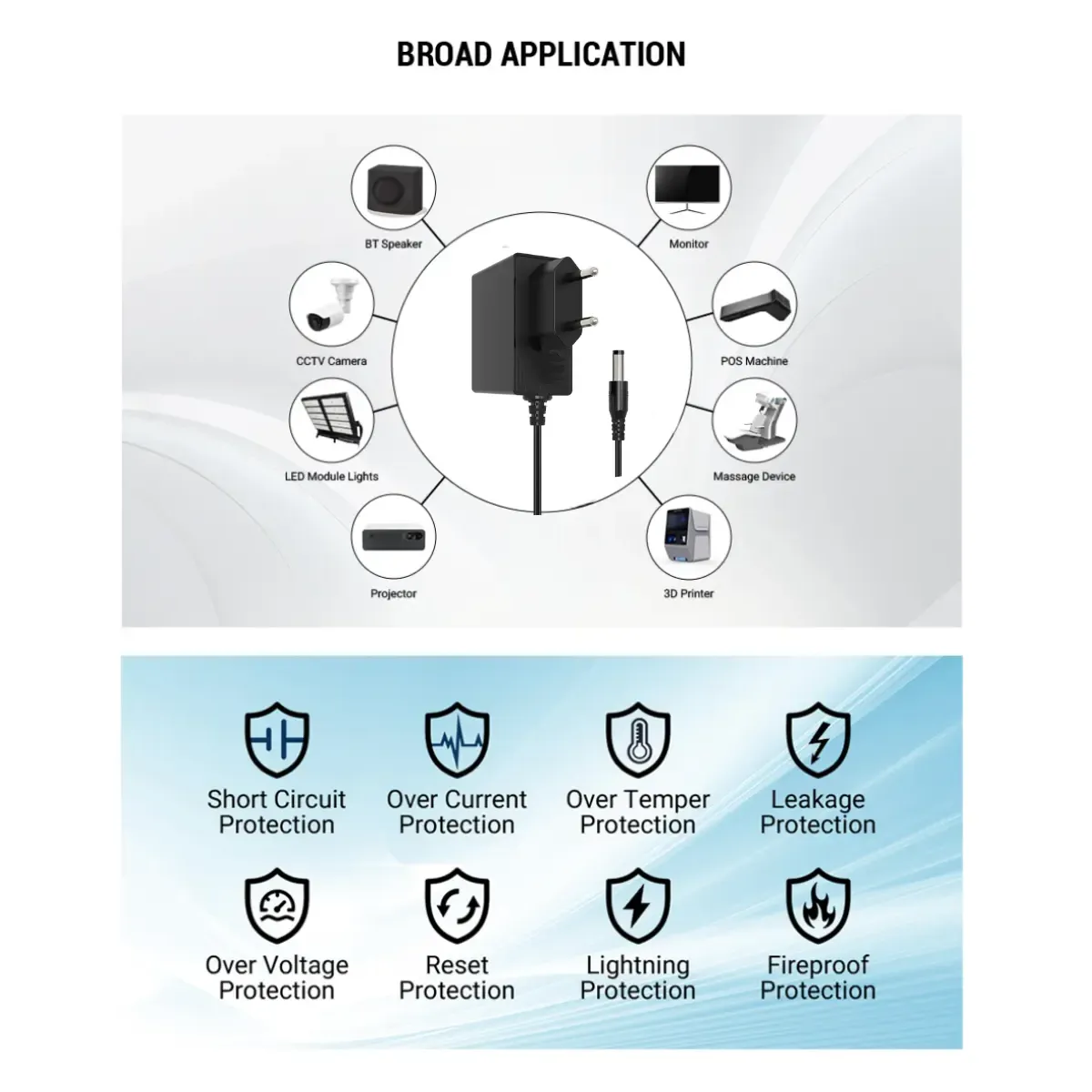2. سازگاری گسترده: با خروجی استاندارد 12 ولت و دوشاخه بشکه DC معمولی (معمولاً 5.5*2.1 میلیمتر)، برای دستگاههای مختلف مانند روترها، سوئیچهای شبکه، دوربینهای امنیتی، ستاپ باکسها و کنسولهای بازی مناسب است.