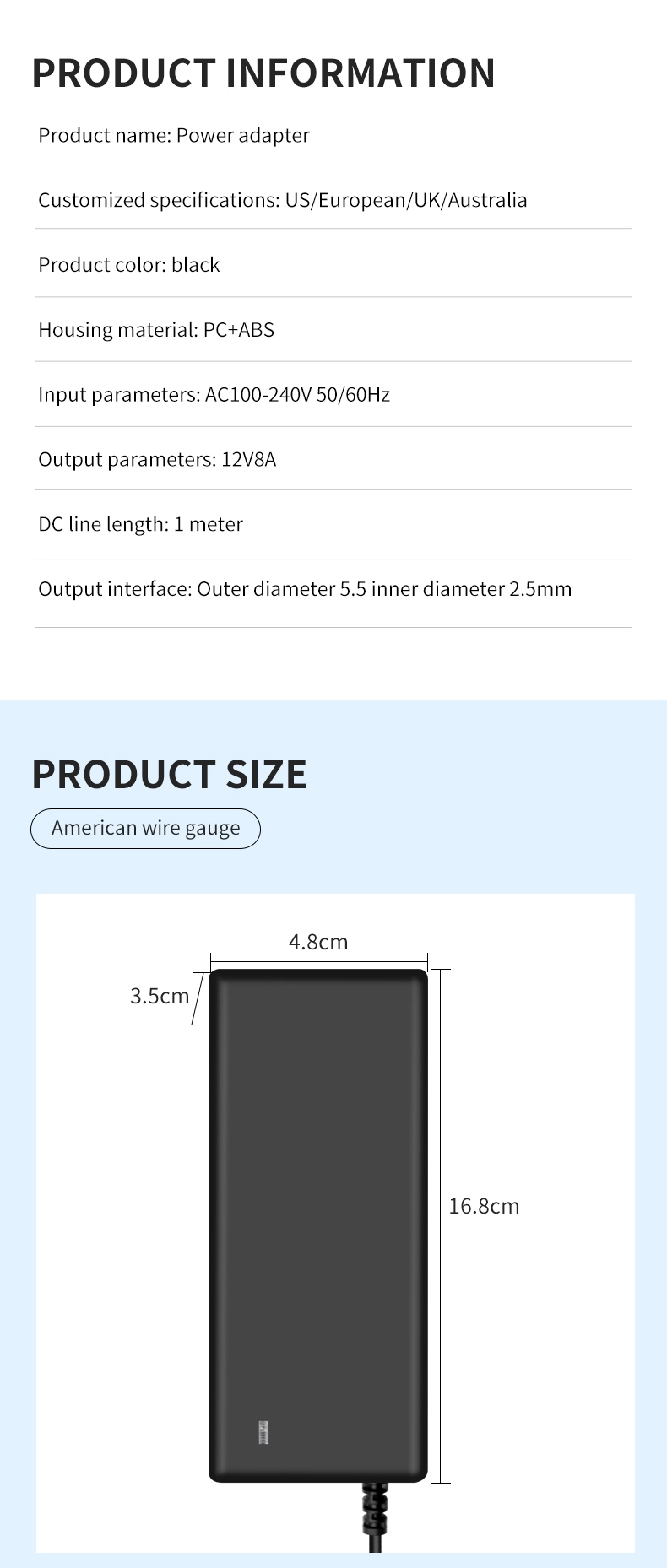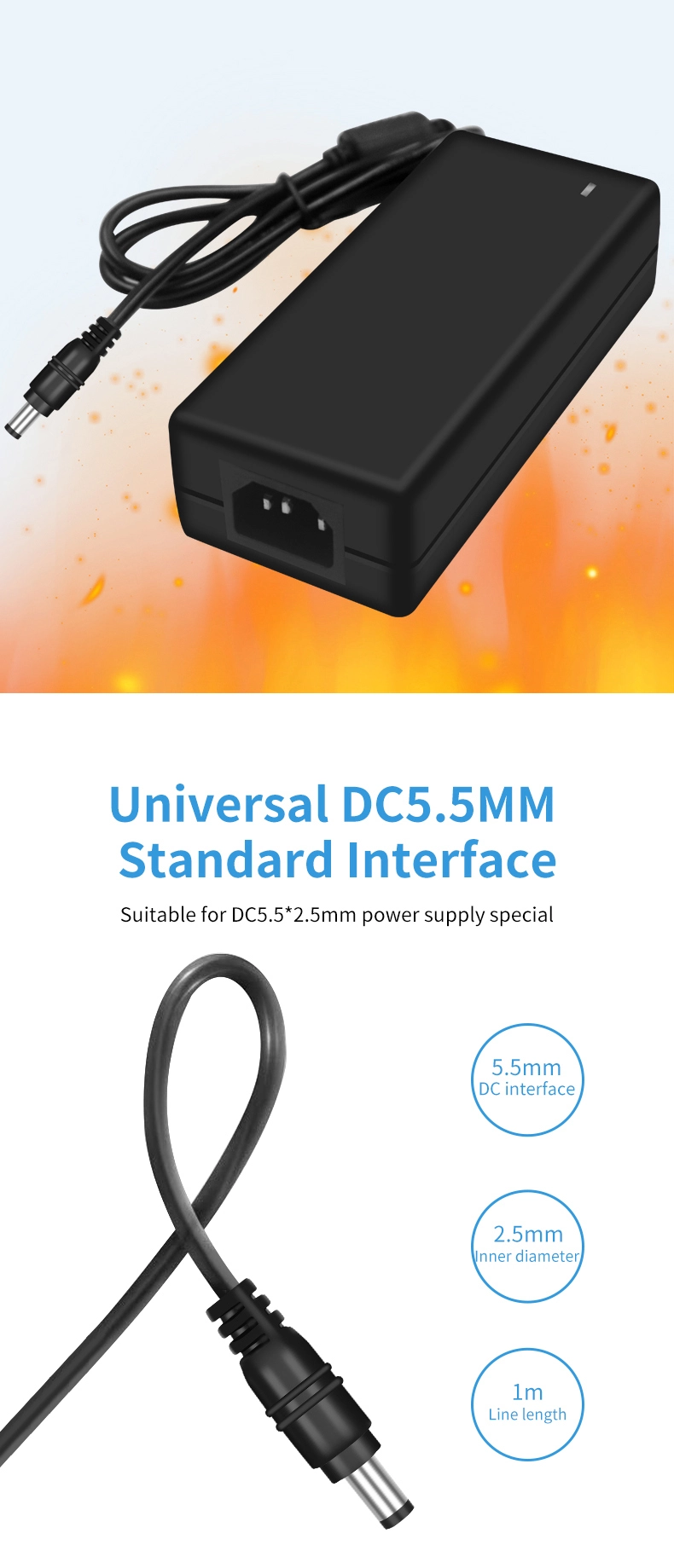 ورودی ولتاژ 100-240 ولت AC با شبکه های برق در بیش از 100 کشور در سراسر جهان سازگار است. کابل خروجی گسترش یافته 1.5 متری (قطر 1.0 میلی متر مربع) همراه با یک کانکتور DC قابل چرخش 180 درجه، با سناریوهای مختلف نصب سازگار است. با اندازه جمع و جور تنها 120×60×30 میلی متر، 35 درصد کوچکتر از آداپتورهای سنتی با همان قدرت است و تنها 280 گرم وزن دارد که قابلیت حمل 50 درصد را بهبود می بخشد.