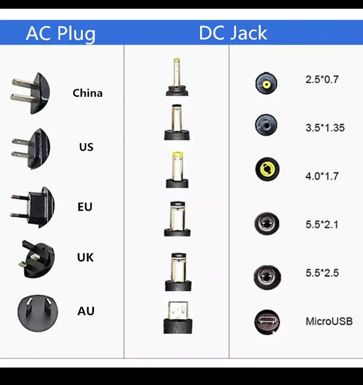نوع رابط: کانکتور بشکه DC استاندارد (اندازه های معمول شامل 5.5mm×2.1mm یا 5.5mm×2.5mm، قابل تنظیم بر اساس نیاز دستگاه).