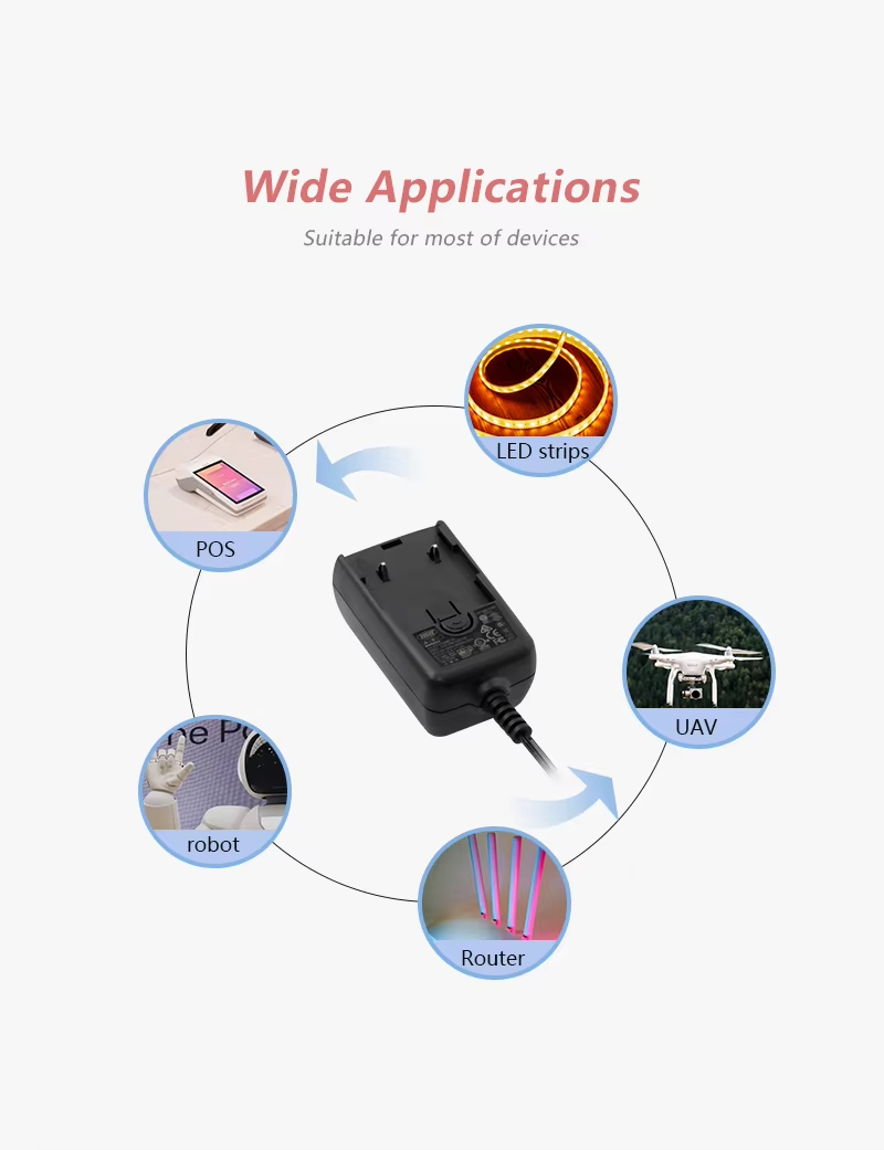 طیف گسترده ای از سناریوهای کاربردی: چه برای تغذیه نوارهای نور LED، بلندگوهای هوشمند، روترهای شبکه، یا سایر لوازم الکتریکی کوچک، این منبع تغذیه قدرتمند سوئیچینگ با دوشاخه قابل تعویض ایده آل ترین و مطمئن ترین انتخاب شماست!
