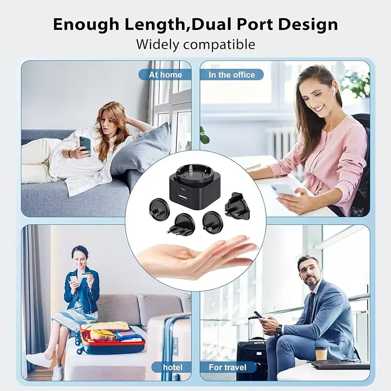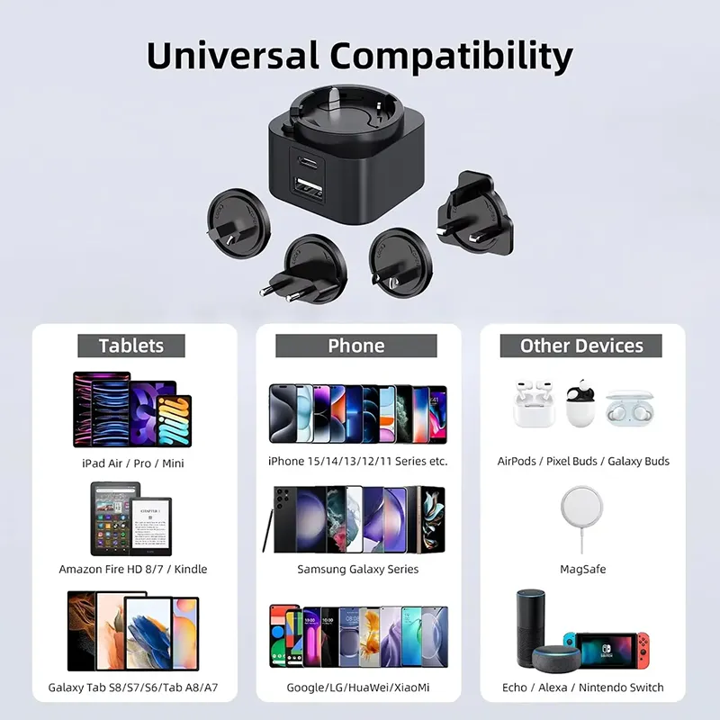 تطبیق پذیری کلیدی است. طراحی دو پورت (USB-C/USB-A) به شما امکان می دهد دو دستگاه را به طور همزمان شارژ کنید. شارژر قابل تعویض 30 واتی Plug PD دارای مجموعه ای از دوشاخه های قابل تعویض (US/EU/UK/AU) می باشد که آن را به همراه کامل سفر شما در سراسر جهان تبدیل می کند. چه در حال شارژ گوشی هوشمند، تبلت یا لپ تاپ باشید، سازگاری جهانی عملکرد بالاتری را تضمین می کند.