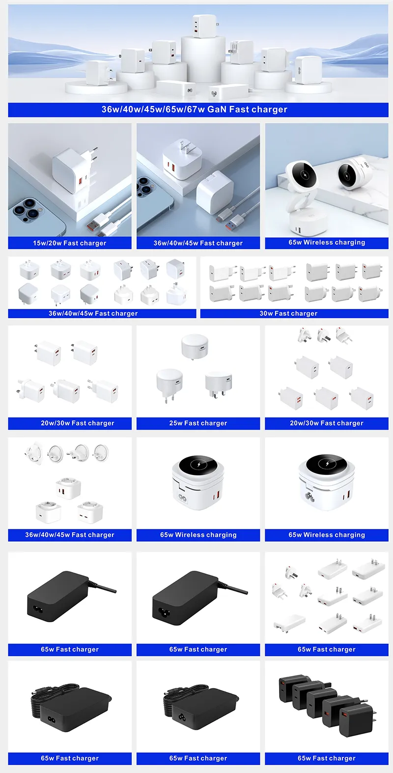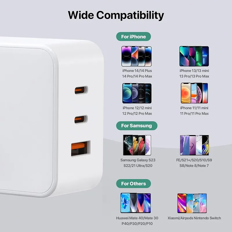 این شارژر تا 65 وات برق ثابت ارائه میکند و لپتاپها (مانند MacBook Air/Pro، Dell XPS)، تبلتها، گوشیهای هوشمند (iPhone، Samsung Galaxy) و سایر دستگاههایی که از پروتکل PD پشتیبانی میکنند، به طور موثر شارژ میکند. طراحی جمع و جور و سبک وزن آن، آن را برای سفر ایده آل می کند، در حالی که حفاظت از اضافه ولتاژ، جریان اضافه و اتصال کوتاه داخلی، شارژ ایمن شارژر و دستگاه های متصل را تضمین می کند. معمولاً به 1-2 رابط USB-C مجهز است که از شارژ همزمان چندین دستگاه کوچک پشتیبانی می کند و قدرت و راحتی را متعادل می کند.