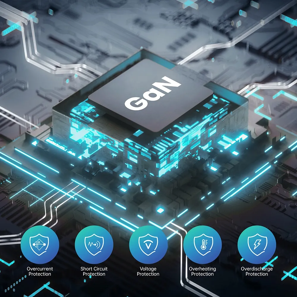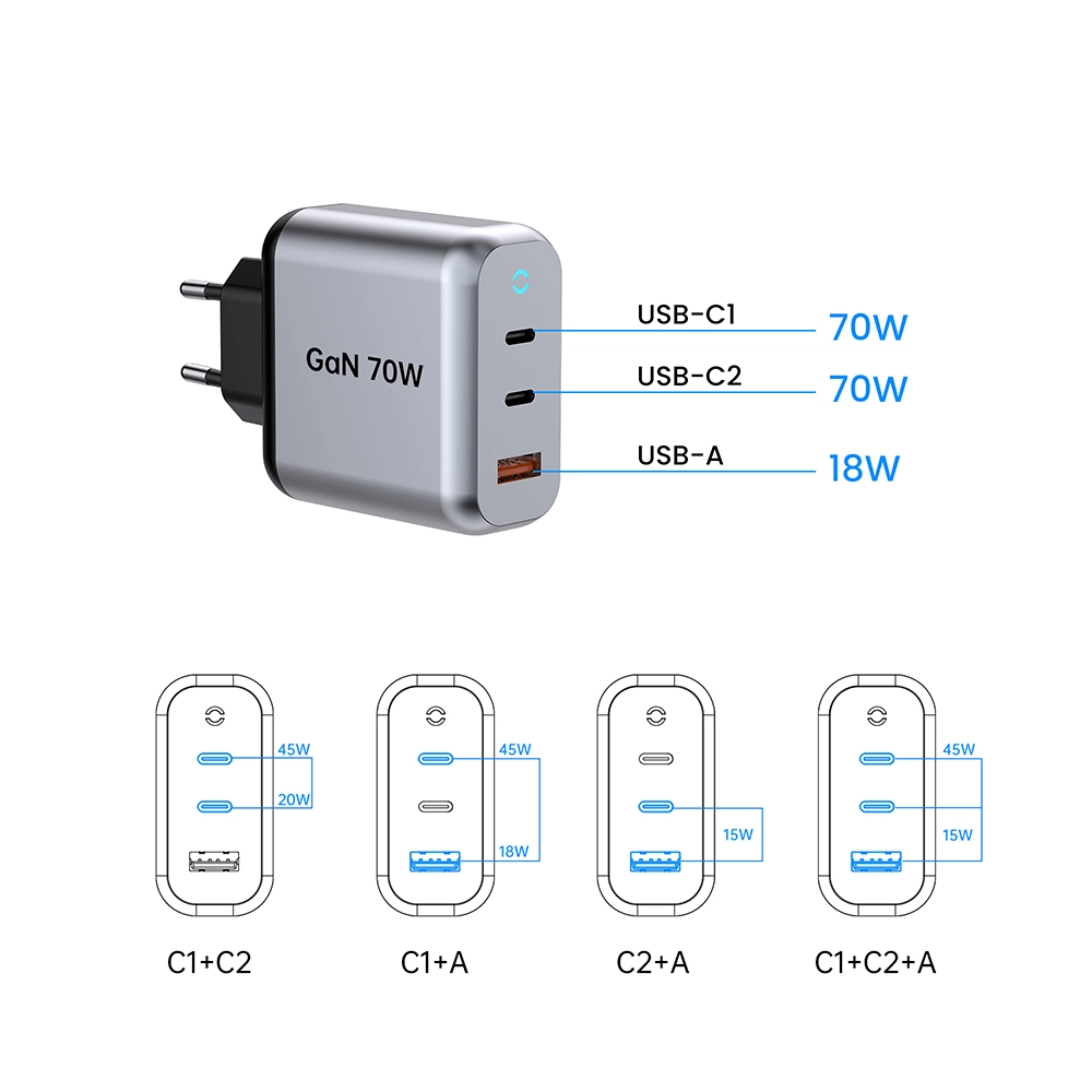 خروجی C1/C2: 5V3A,9V3A,12V3A,15V3A,20.6V3.4A (حداکثر 70W) PPS: 3.3-11V 4.05A خروجی USB-A: 5V3A,9V2A,12V1.5A 3.3-11V 2A (22W حداکثر) خروجی C1+C2: 45W+20W خروجی C1+C2+USB-A: 45W+5V3A مجموع: 70 وات |