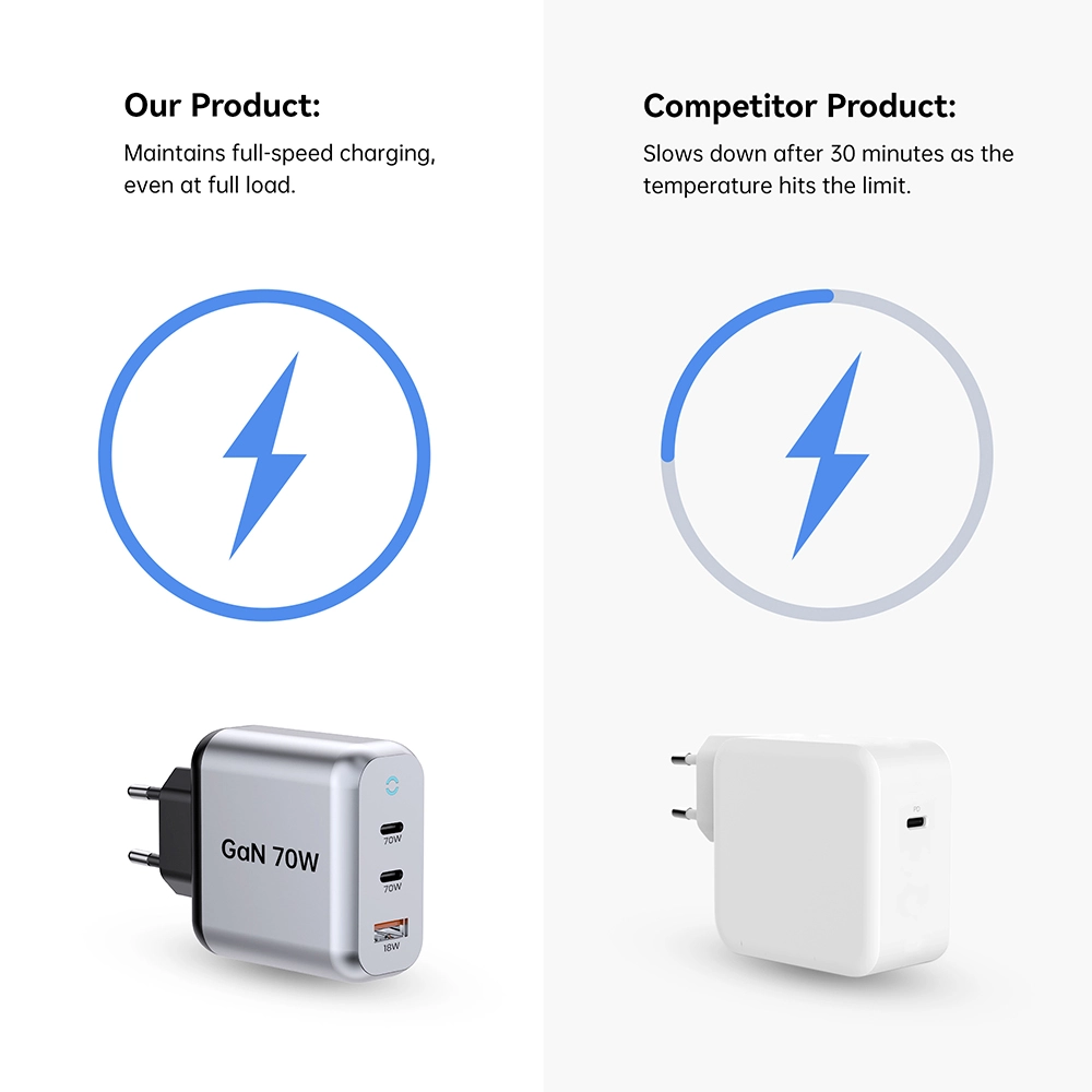 شارژر سریع 70 واتی PD Starwell برای تبلت لپتاپ که شارژر سریع 70 واتی GaN نیز نامیده میشود: 2C1A، نیاز روزانه به شارژ سریع تلفنهای همراه و دستگاههای تبلت را برآورده میکند. اندازه کوچک، عملکرد قوی، با تکنولوژی پیشرفته نیترید گالیوم. در صورت استفاده در یک پورت، حداکثر توان خروجی رابط USB-C1 70 وات است. هنگامی که این دو درگاه با هم استفاده میشوند، USB-C1 همچنان شارژ سریع 45 واتی PD را حفظ میکند. از چندین پروتکل شارژ سریع، از جمله PD3.0، PPS، QC4+ و QC3.0 پشتیبانی میکند و از سازگاری گسترده با دستگاههای مختلف اطمینان میدهد.