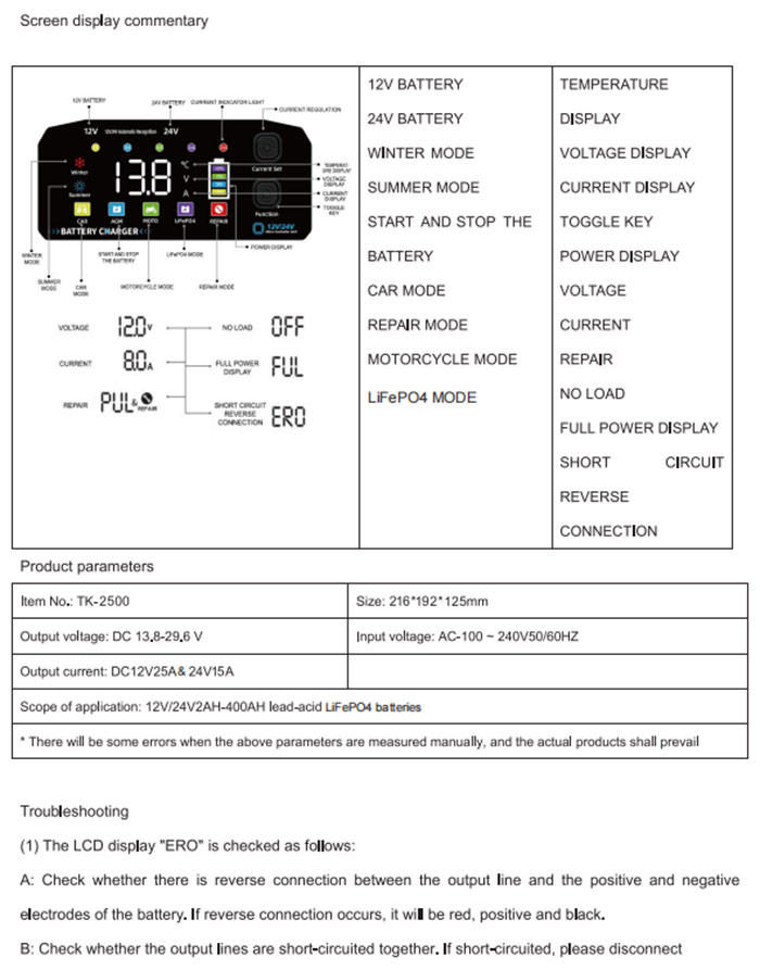 سازگاری جهانی 12 ولت / 24 ولت: به طور یکپارچه بین سیستم های باتری استاندارد 12 ولتی و قدرتمند 24 ولتی شارژ با یک دستگاه تک و همه کاره جابجا شوید. ایده آل برای اتومبیل، موتور سیکلت، کامیون، قایق، تراکتور چمن، و بیشتر.